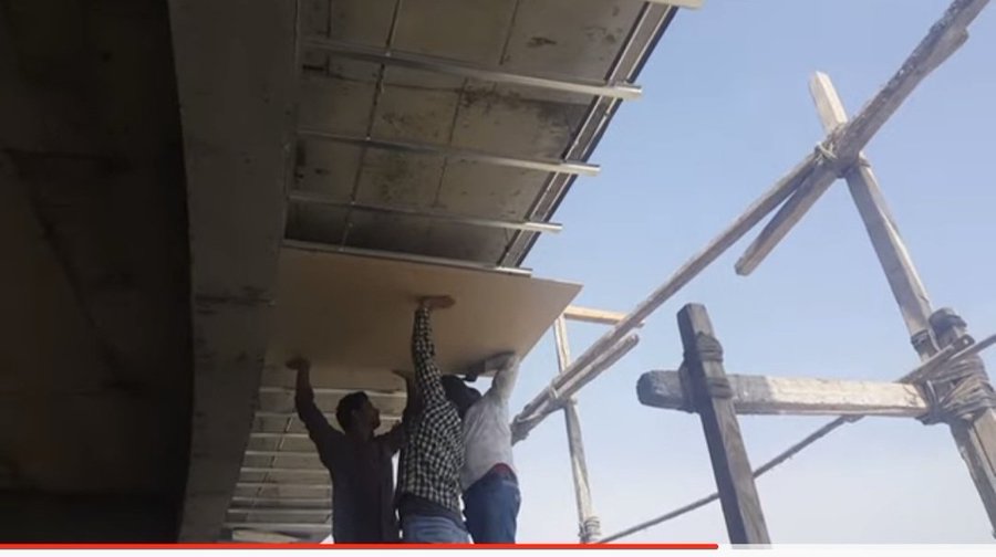صورة توضح تركيب أسمنت بورد على هيكل حديد.